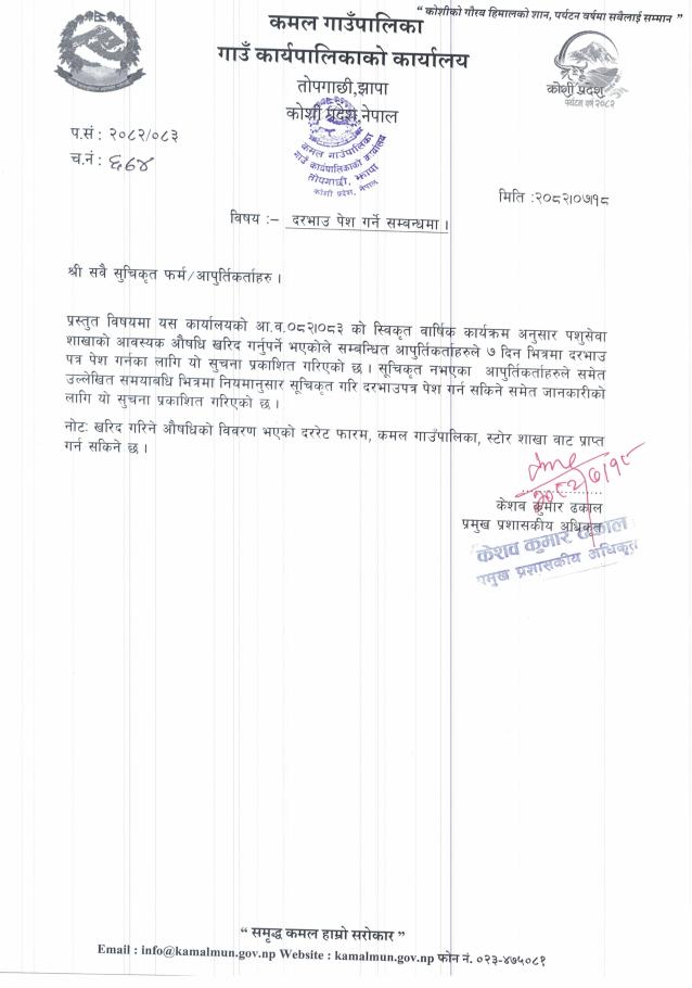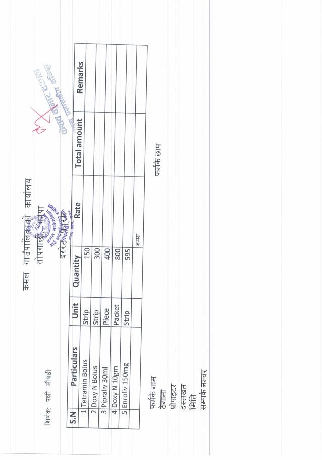 पशुसेवा शाखाको आवस्यक औषधि खरिद गर्न दरभाउ पेश गर्ने सम्बन्धमा ।