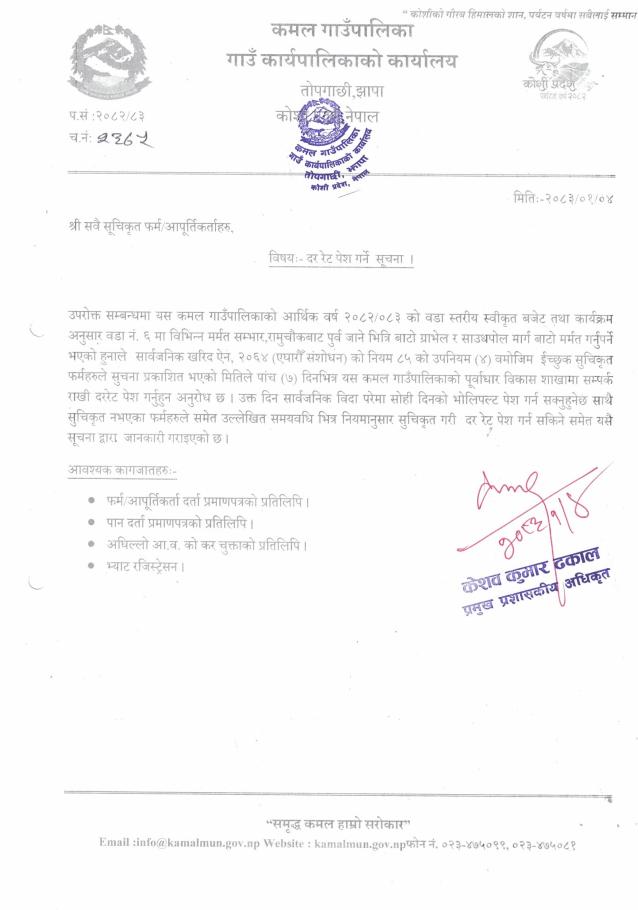 दर रेट पेश गर्ने सम्बन्धमा।