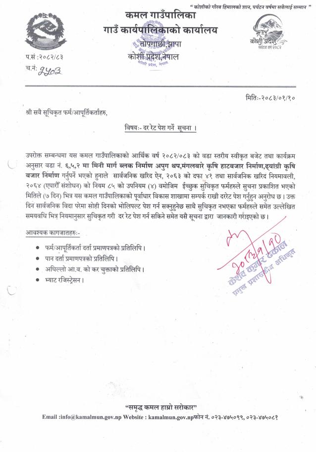 दर रेट पेश गर्ने सम्बन्धी सूचना ।