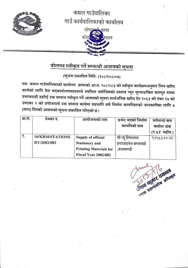 बोलपत्र स्वीकृत गर्ने सम्बन्धी आशयको सूचना।