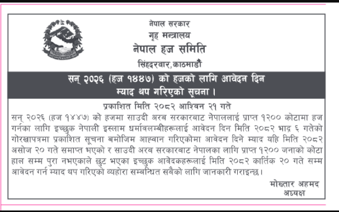 » सन् 2026 को हजको लागि आवेदन दिन म्याद थप गरिएको सूचना ।