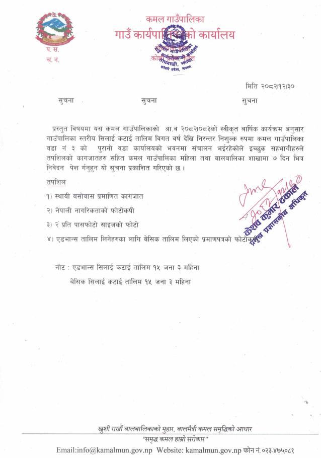 » सिलाई कटाई तलिम सम्बन्धी सूचना ।