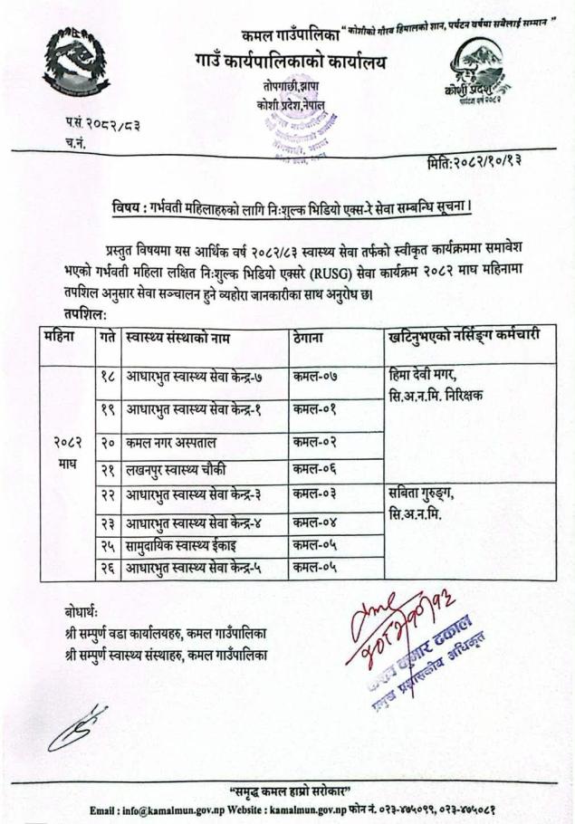 » गर्भवती महिलाहरुको लागि निःशुल्क भिडियो एक्स-रे सेवा सम्बन्धि सूचना।