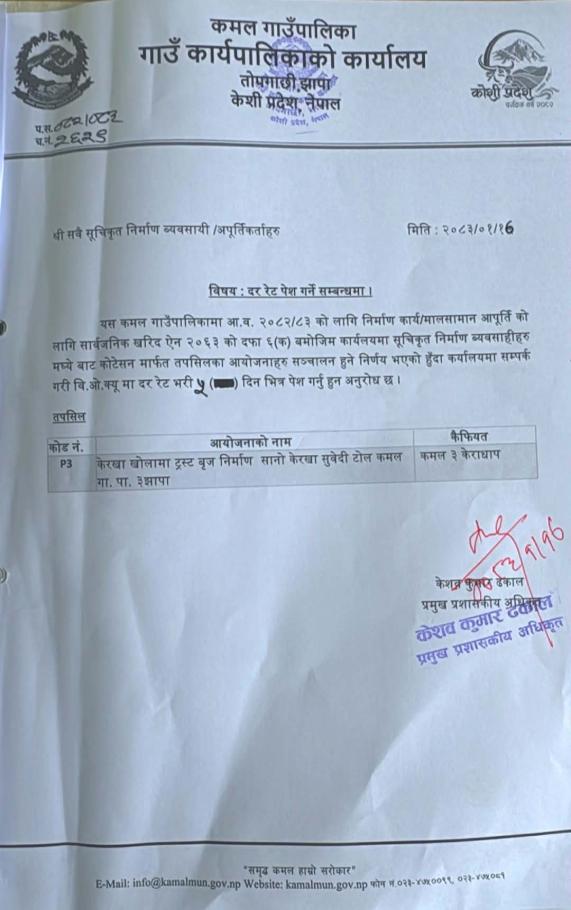 दर रेट पेश गर्ने सम्बन्धी सूचना ।