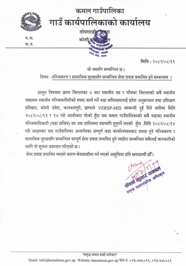 » पञ्जिकरण र सामाजिक सुरक्षासँग सम्बन्धित सेवा प्रवाह प्रभावित हुने सम्बन्धमा ।