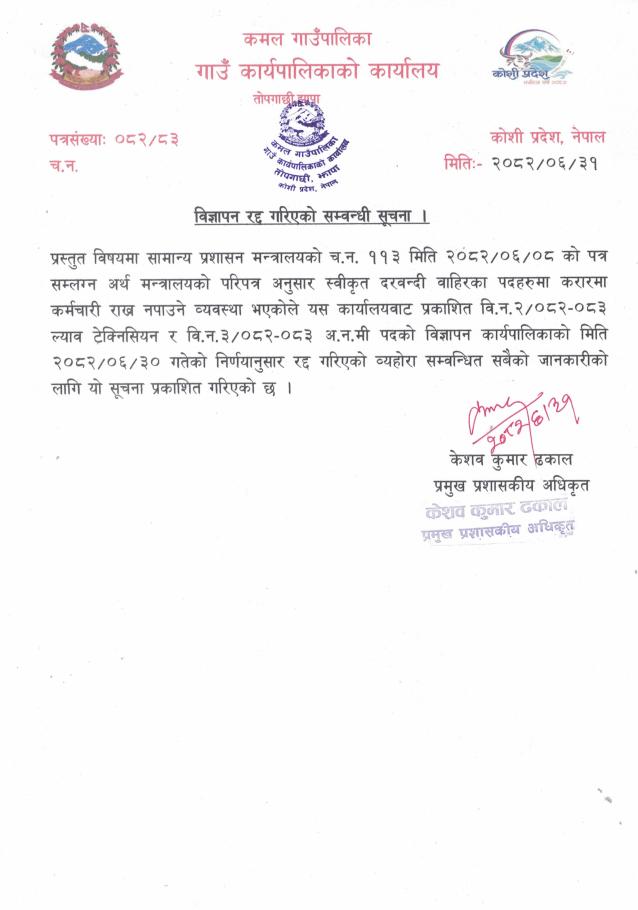 विज्ञापन रद्द गरिएको सम्बन्धी सूचना ।