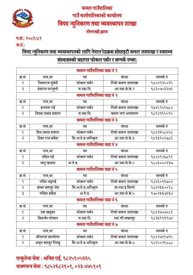 कृपया आपतकालीन अवस्था वा विपदमा निम्न सम्पर्क नम्बरहरूमा तुरुन्त सम्पर्क गर्नुहोस् ।