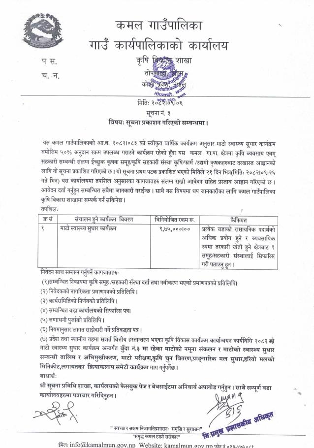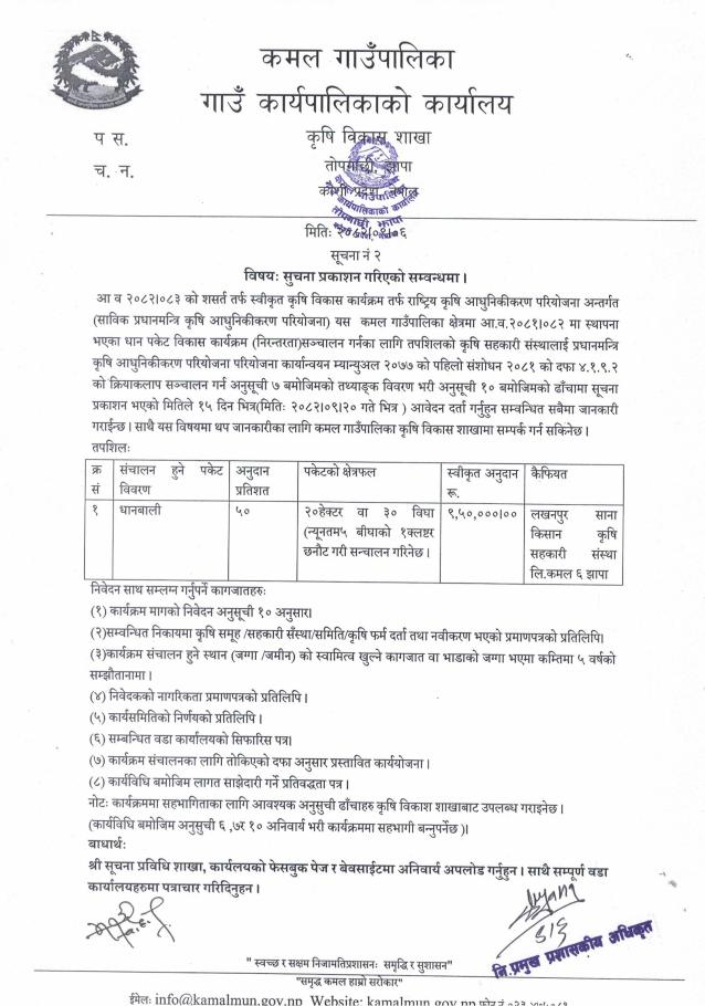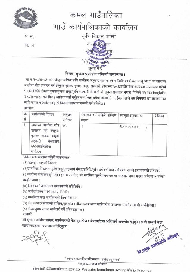 कृषि औजार उपकरण ५० % साझेदारीमा सञ्चालन सम्बन्धी सूचना प्रकाशन गरिएको सम्बन्धमा ।