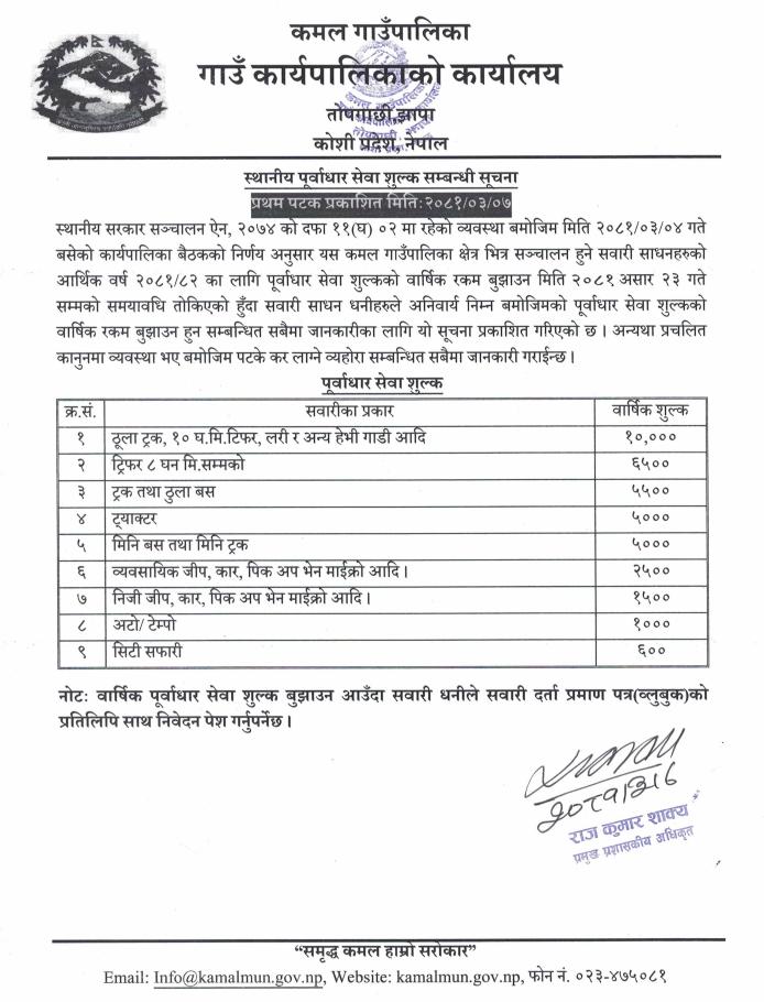 स्थानीय पूर्वाधार सेवा शुल्क सम्बन्धी सूचना ।